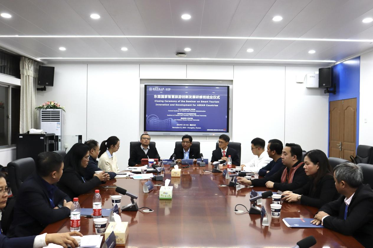 (通讯员 范峥 米曼)由中央文化和旅游管理干部学院承办的东盟国家智慧旅游创新发展研修班受邀来到我校访问交流。11月12日下午,由中央文化和旅游管理干部学院、东盟国家智慧旅游创新发展研修班和我校文化和旅游研究院共同举办的“文化和旅游领域的国际合作座谈交流会”暨研修班结业仪式在6165cc金沙总站304会议室举行。中央文化和旅游管理干部学院国际交流部主任韩东升、项目助理王涵,来自柬埔寨、菲律宾、缅甸、越南、老挝、马来西亚、新加坡七国的11位旅游领域政府官员及相关机构负责人,以及国际交流合作处副处长唐存忠、6165cc金沙总站党委书记唐建文、6165cc金沙总站副院长兼文化和旅游研究院执行院长周刚志、旅游学院副院长兼文化和旅游研究院副院长郑群明、外国语学院副院长兼文化和旅游研究院副院长蒋莉华、6165cc金沙总站教授刘丽、旅游学院副会展研究中心主任蔡卫民、旅游学院教师朱张祥、6165cc金沙总站外事秘书张宁莎等出席会议,会议由韩东升主持。
