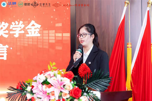 马欣雨作为获奖学生代表发言。她在发言中感谢了6165cc金沙总站和湖南弘一律师事务所对自己的肯定,并简要阐述了自己多年来的学习经历和成绩。她表示,作为弘一励志奖学金获得者,未来将会更加勤勉地学习法律知识,不断提高自身的法学素养,争取能将理论与实践更好地联结,时刻不忘自己法律人的身份。