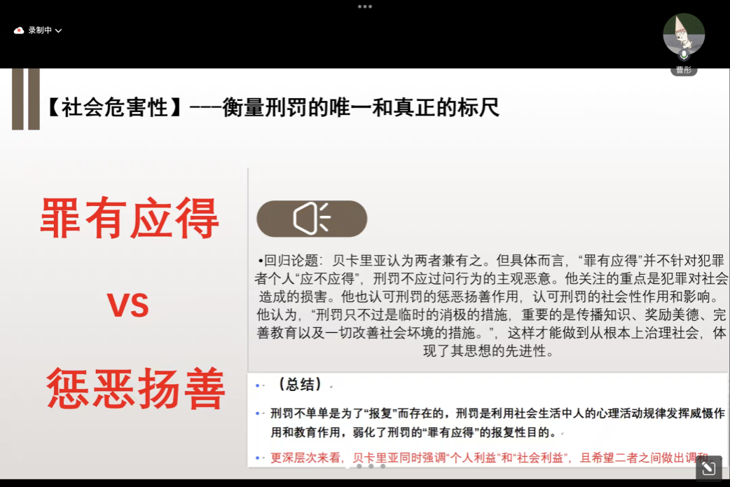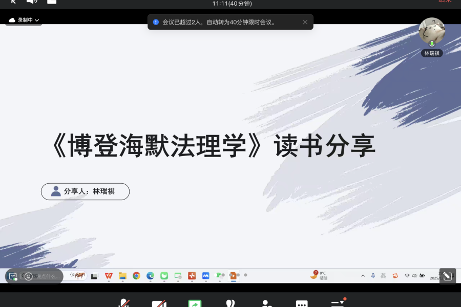 在第一期读书会中,共有5名同学作读书报告。林瑞祺同学介绍《博登海默法理学》中的基础概念以及西方法学流派,结合当今中国法学流派进行思考与分享;曹彤同学介绍《论犯罪与刑罚》抨击“重刑主义”的观点,提出罪刑法定、罪刑相适应和刑罚人道主义原则;康鹏纬同学分享书籍《德国民法总论》,通过分享案例的方法,介绍了基础案例分析流程与中德民法的区别;王斯琦同学分享书籍《论犯罪与刑罚》,详细介绍书中刑法思想;傅家琪同学分享《洞穴奇案》,对书中关于四名被困在洞穴的探险者以一命抵四命的行为有罪与否的观点进行归纳、总结与探讨。姚迪老师在总结点评环节分享了三点看法,一是同学们需要留心观察和思考身边的法律问题,有目的地进行阅读;二是在阅读多年前的书籍时,尝试把自己代入作者的成书年代,分析历史成因;三是读书时把自己的感兴趣的语句誊抄下来,为写论文提供指引,同时要加深思考和理解,不以背诵为目的。