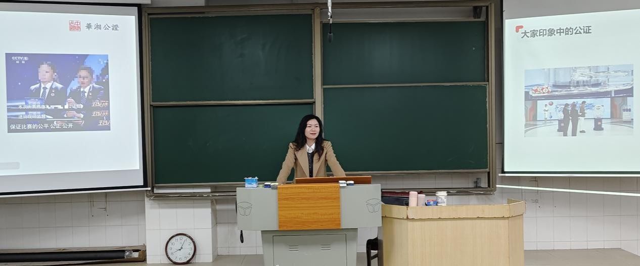 陈婷主任首先以生动的案例为切入点,向同学们展示了公证职业的多元性与重要性。她将公证比喻为“法律安全工程师”“社会治理参与者”和“公共权益守护者”,强调公证在预防法律纠纷、维护法治建设等方面具有重要作用。公证不仅涉及传统的合同、遗嘱等领域,还在知识产权保护、跨境文书认证、数字版权保护等方面发挥着关键作用。陈婷主任指出,公证行业相较于律师行业具有更少的内卷和更高的社会认可等优势。长沙市律师人数众多,而公证员数量相对较少,这为有志于从事公证工作的法学生提供了广阔的发展空间。她强调,公证行业是一片“蓝海”,并鼓励同学们抓住这一机遇。