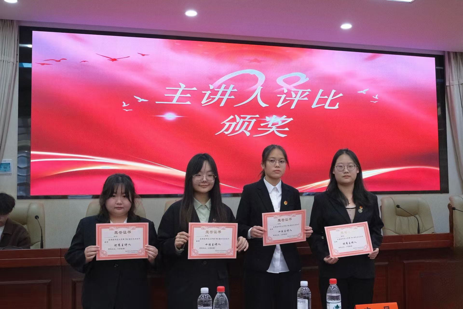 最后,现场就2025年全国两会有关内容组织知识竞答,同学们积极参与,现场气氛活跃。根据评委老师对四位主讲人的评分,卜湘蓉获评“十佳主讲人”,张丹、曹梦洁、郭放获评“优秀主讲人”。