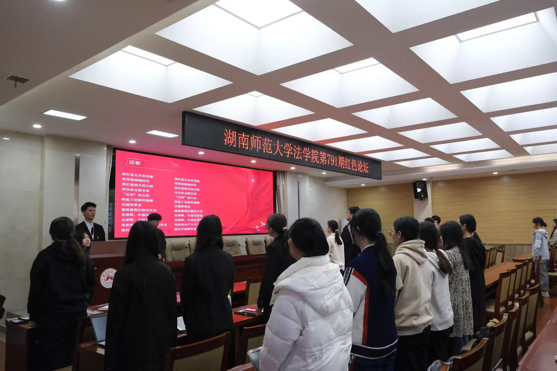 活动伊始,全体起立,奏唱团歌。随后,主讲人张丹、曹梦洁、卜湘蓉、郭放依次结合学科专业特色和个人经历分享了对2025年全国两会精神的理解与体会。张丹从知行合一的角度,强调法科学子应锚定时代使命,贡献青春力量;曹梦洁聚焦法学领域改革,呼吁个人成长应坚持理论与实践并重,努力使自己成为时代需要的复合型法律人才;卜湘蓉结合基层法治实践,侧重“从泥土中寻找法治答案”,鼓励同学们积极投身法治实践,在实践中实现自我价值;郭放通过解读两会报告,鼓励同学们坚定理想信念,践行两会精神,谱写满意的个人答卷。接着,四位主讲人对同学们的提出的问题进行了解答。