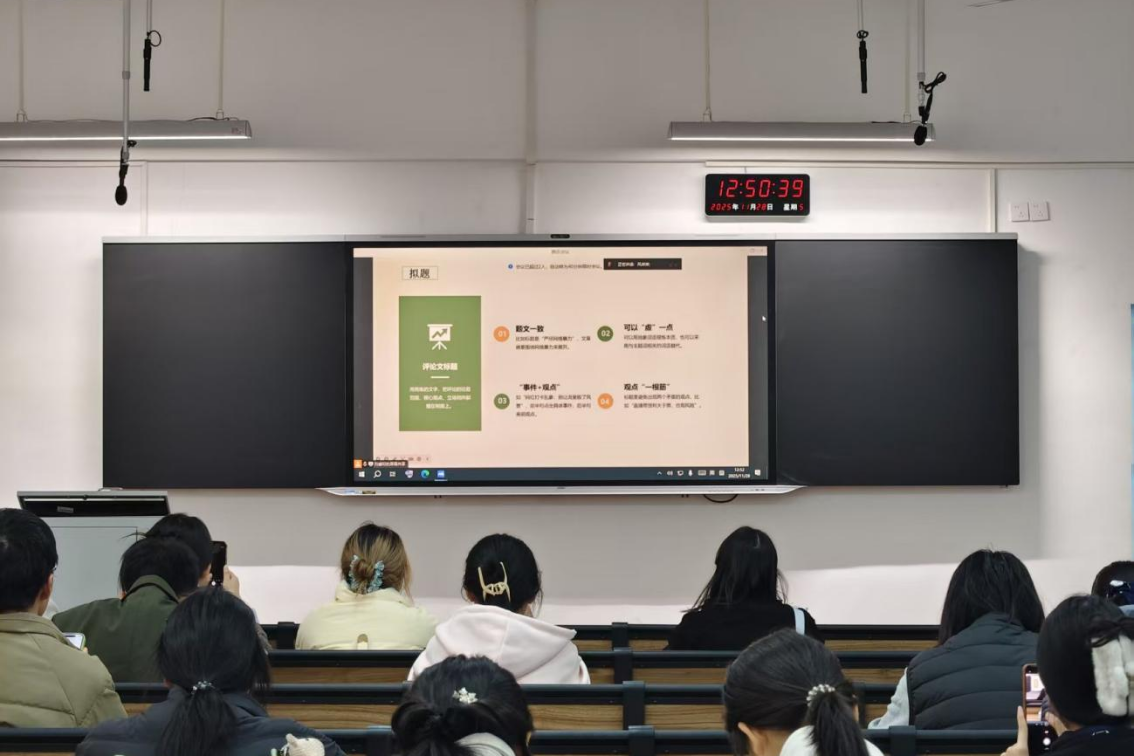 (通讯员 刘睿珩 黄心怡)11月28日中午,金沙官网第十期烽火团校技能培训班在二里半校区景德楼南栋202教室与桃花坪校区实训楼201教室,通过线上线下相结合的方式同步开展“评论文写作技巧”专题课程。课程由金沙官网青传评论部部长卜湘蓉主讲,院团委发展部干事黄心怡主持。